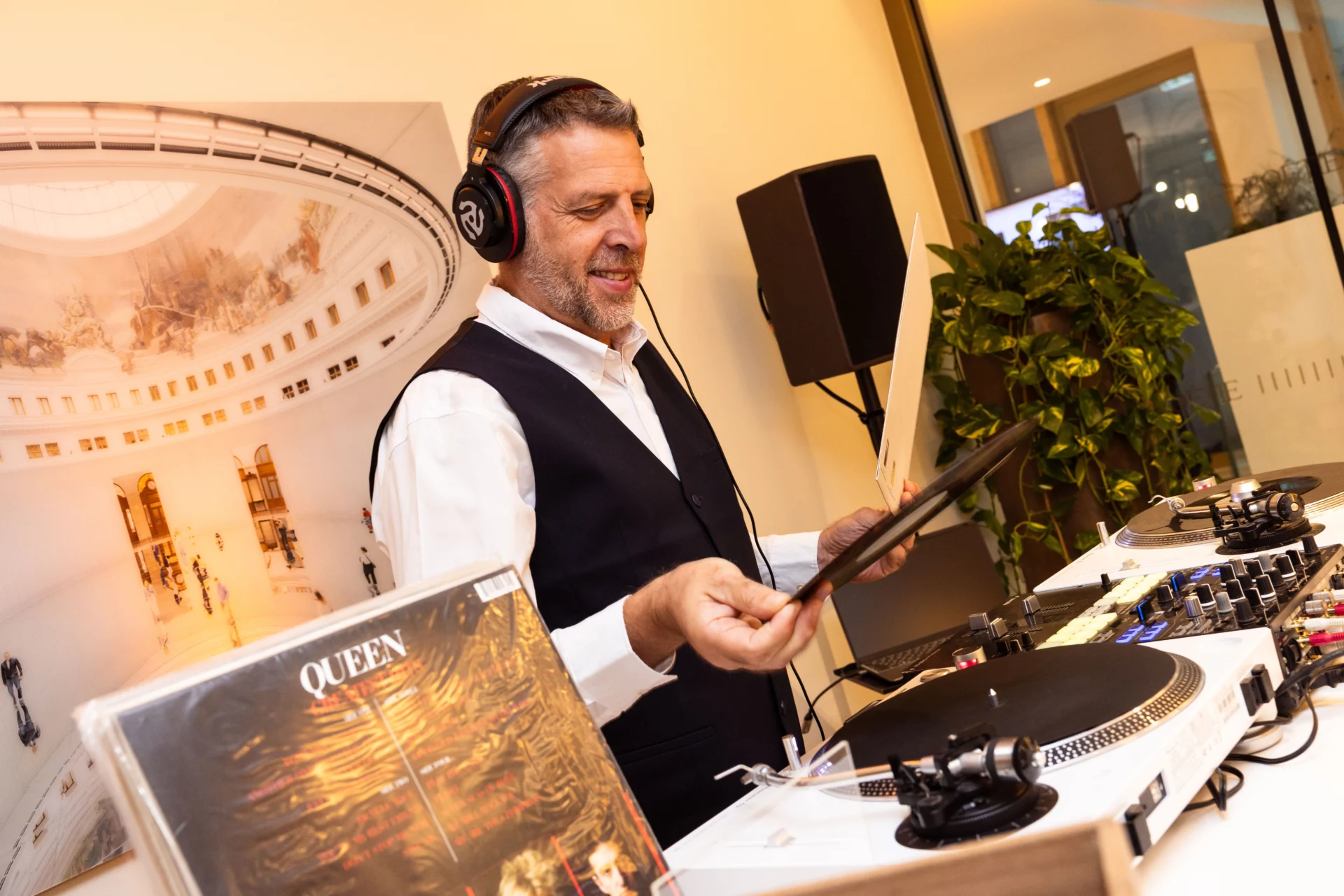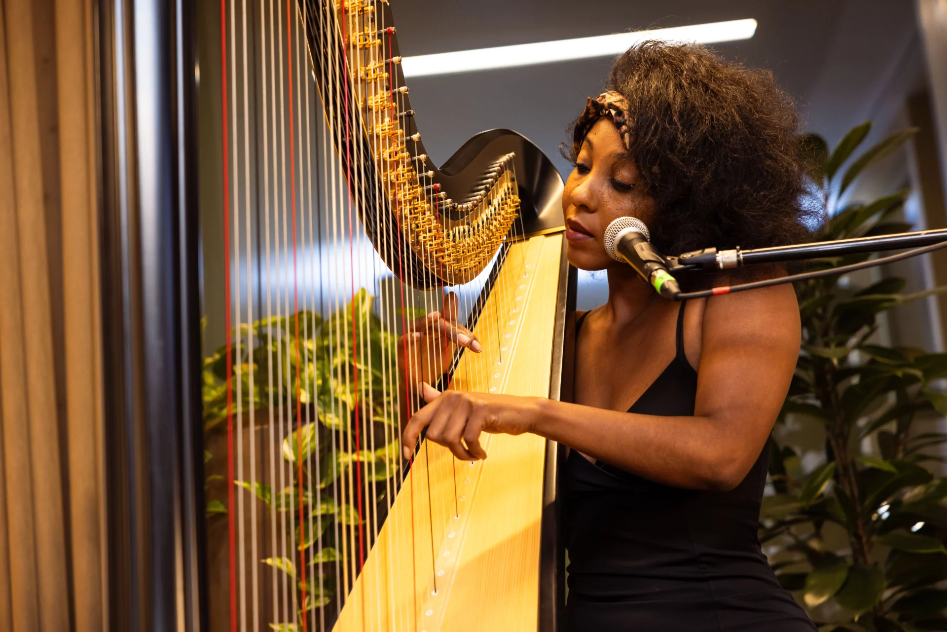 Côté ambiance, les convives ont pu profiter de deux atmosphères musicales distinctes selon les étages. Tandis qu’une harpiste offrait un moment suspendu d’élégance, le bar à vinyles proposait une immersion plus rétro et conviviale, créant un contraste harmonieux et raffiné.